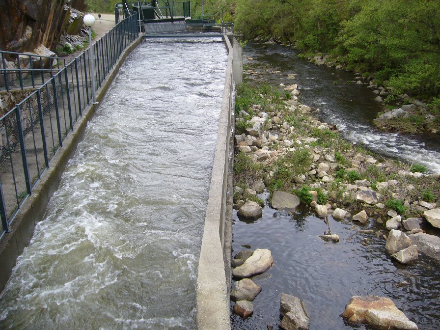O caudal ecolóxico é o da dereita. Así é como iban os casi 3 km. de río entre o azud e a salida de auga por debaixo das turbinas.