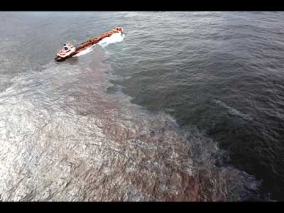 A esa estela hay que sumar 10000 litros en el momento de hundirse. En la fotografía se ve la proa además de dos remolcadores. |
