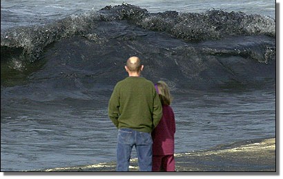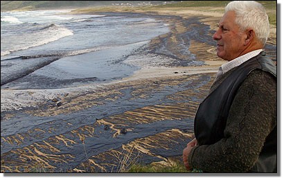 Lo que está pasando en Galicia, en toda la Galicia costera es dantesco, no tiene nombre. Tenemos toda Galicia contaminada por el Fuel, el "Dios nos coja confesados....de hace unos días es una realidad hoy, 13 de diciembre del 2002". Estamos perdidos, no hay organización, no hay mando, no hay medios, mucho gastar dinero en cientos de cosas inútiles y ahora no tenemos ni barcos, ni medios para poder con el Fuel...Triste historia. Lamentable historia. Nuestra destrucción por unos cuantos años, muchos años. Mientras tanto el gobierno actual, no admite el fracaso absoluto de su gestión. Penoso, esperpéntico, surrealista y lamentable. Pienso que sabremos salir adelante, confío en mi pueblo ... no confío en nuestros gobernantes actuales. Nos han llevado a la desgracia, es evidente. Les remito para terminar, a una poesía de Manuel María que es lo que sentía en aquellos momentos: |