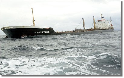 El Prestige (petrolero de las Bahamas) trasportaba 77.000 toneladas de fuel-oil cuando por razones desconocidas empezó los vertidos. Se calcula en 40000 toneladas lo perdido por el Prestige de momento. Hoy está hundido pero sigue soltando fuel, sobre 40000 litros diarios.